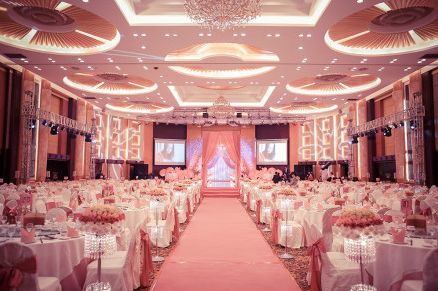 如果在宴会厅厅小的情况下,我们建议您厅内T台的跨度可以比平时适度窄一些,舞台背景前的主题道具可以温馨、精致些。