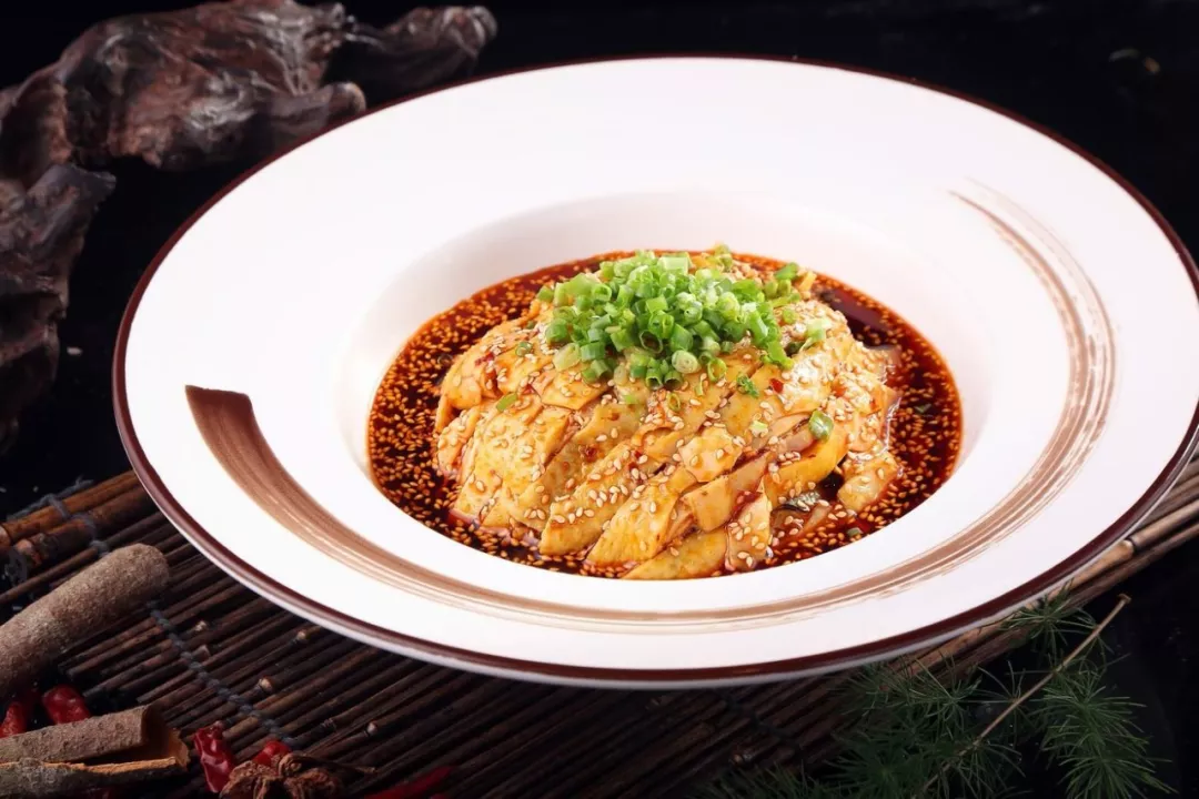 喜唐招牌鸡成功C位出道,一片片又大又薄的鸡肉浸泡在秘制红油中,密密麻麻的芝麻更添加了一份香味,撒上切好的葱花,麻辣鲜香,开胃爽口。